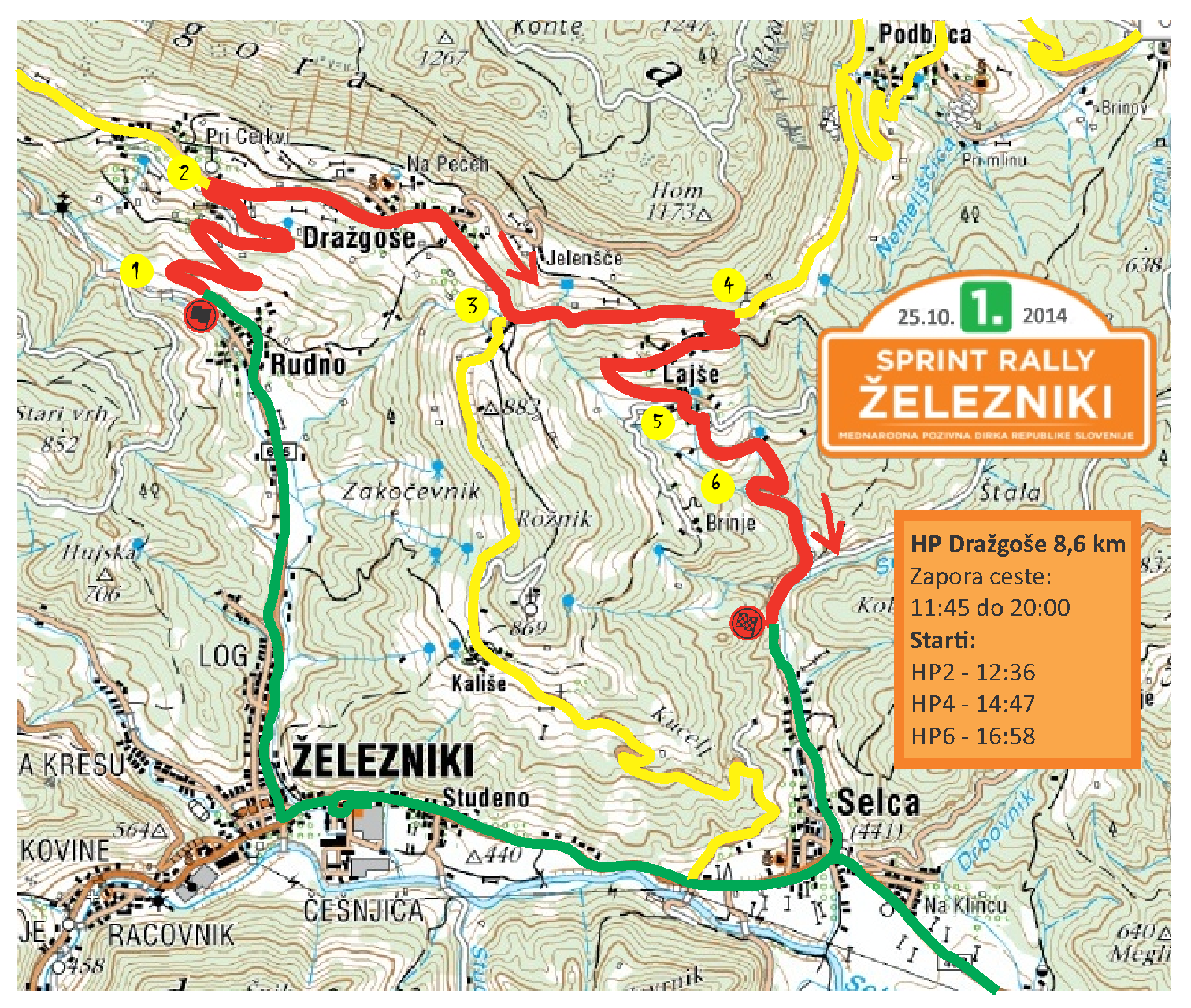Start hitrostna preizkušnje Dražgoše je na koncu vasi Rudno, v smeri Dražgoš. Trasa se vije po pobočju Dražgoške gore, prečka vas Dražgoše, nadaljuje pot proti Jamniku in Kropi in na križišču Lajše/Selca zavije proti vasi Lajše, ki jo prečka in nadaljuje do cilja, ki je v naselju Sevnica, delu vasi Selca. Dostop do trase je dober - po cesti Kranj/Besnica/Dražgoše do cerkve Sv. Jederti, iz Selc preko vasi Kališe do atraktivenga mesta (AM) 3 in seveda preko starta in cilja.