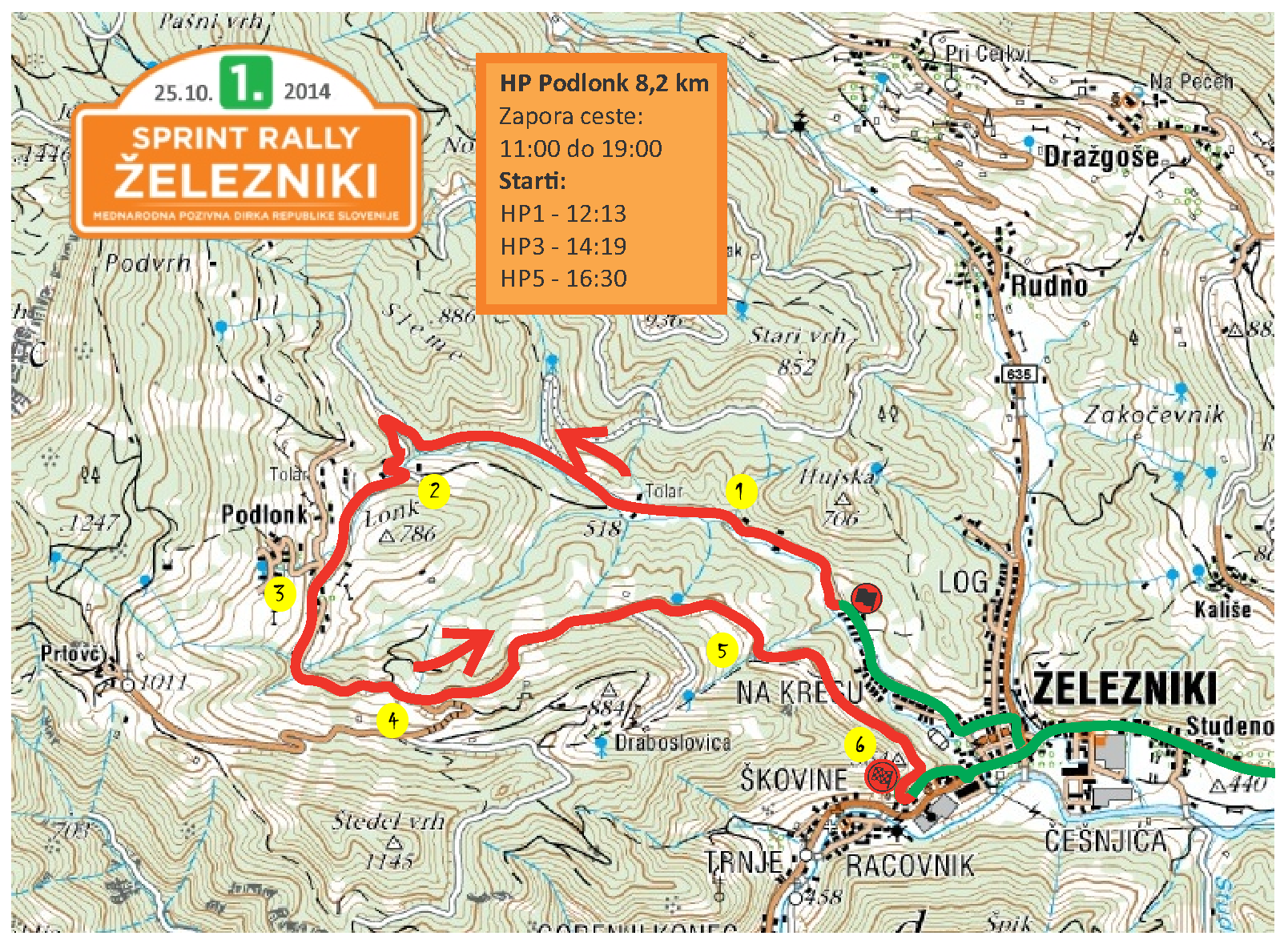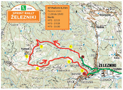 Start HP Podlonk je na koncu naselja Dašnica, do katerega pridete skozi center Železnikov. V centru mesta sledite tabli Rudno/Dražgoše/Kropa in po 100m zavijete levo mimo stolpnic proti Podlonku. Po 1 kilometru skozi naselje Dašnica pridete na start. Trasa HP se vije po dolini, v zadnjem delu se strmo vzpne proti vasi Podlonk, prečka vas, se priključi na cesto Železniki - Prtovč in se spusti proti Železnikom. Cilj HP je na zadnjem ovinku pred Športno dvorano v Železnikih (nad podjetjem Domel). Atraktivnih točk je veliko, so pa nekoliko težje dostopne, saj je do njih možno dostopati le preko starta in cilja, zato vse obiskovalce prosim, da se na HP odpravijo dovolj zgodaj. Zapora ceste je ob 11. uri